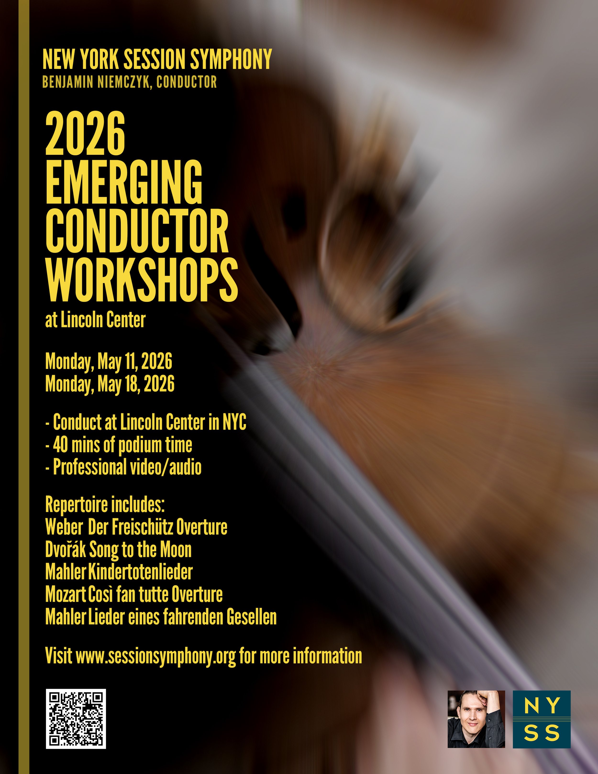 Announcing the 2026 New York Session Symphony (Benjamin Niemczyk, Conductor) Emerging Conductor Workshops at Lincoln Center. The workshops offer emerging conductors the opportunity to conduct an orchestra for 40 minutes, receive instruction and receive a professional recording.